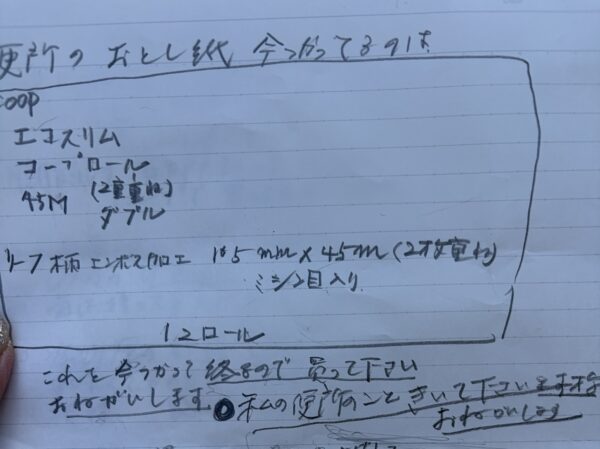 ほんで、私にはコープの今と同じトイレットペーパーを買って。」
